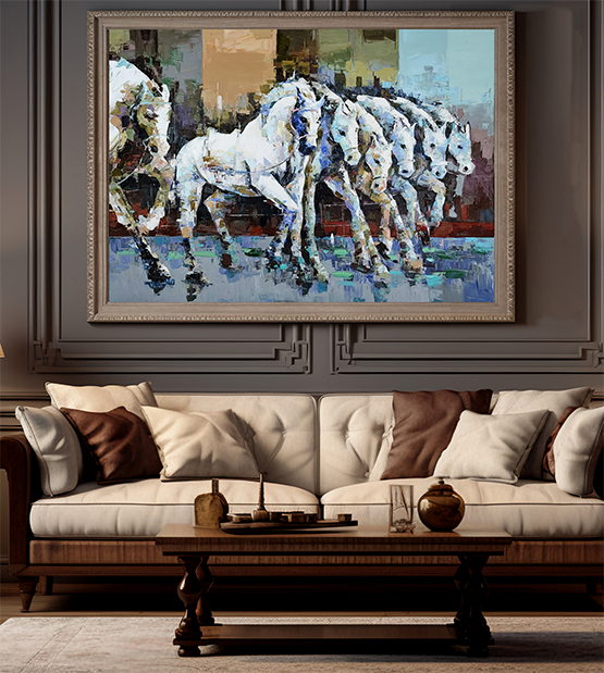 Chakraborty's childhood was marked by economic hardship, thereby he found solace and escape in the world of art. His works radiate positivity through a prismatic color scheme, gradually fading into hues of white, crafting his signature palette. Themes of spirituality, cultural heritage, and the vibrant landscapes of Banaras form the heartbeats of his art. His series and collections, including "The Ganges," "The Sign of Growth," "Seven Horses," and his vibration paintings, intricately weave prismatic colors, creating luminous palettes that exude vitality. Symbolic elements, notably the significance of the number seven, enrich each composition, adding layers of meaning to his narratives. Chakraborty's brushwork evokes a palpable sense of texture, whether capturing the rugged solidity of stone, the coarse roughness of brick, or the fluidity of water. His deft strokes bring forth an almost tangible feel of each depicted element, seamlessly blending technique and artistry.